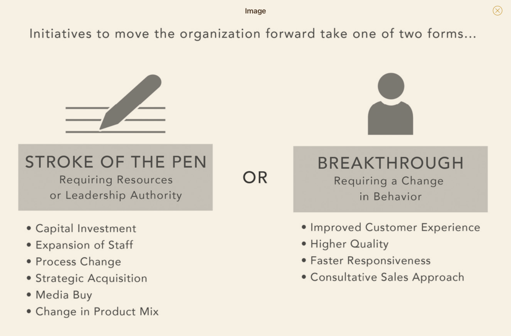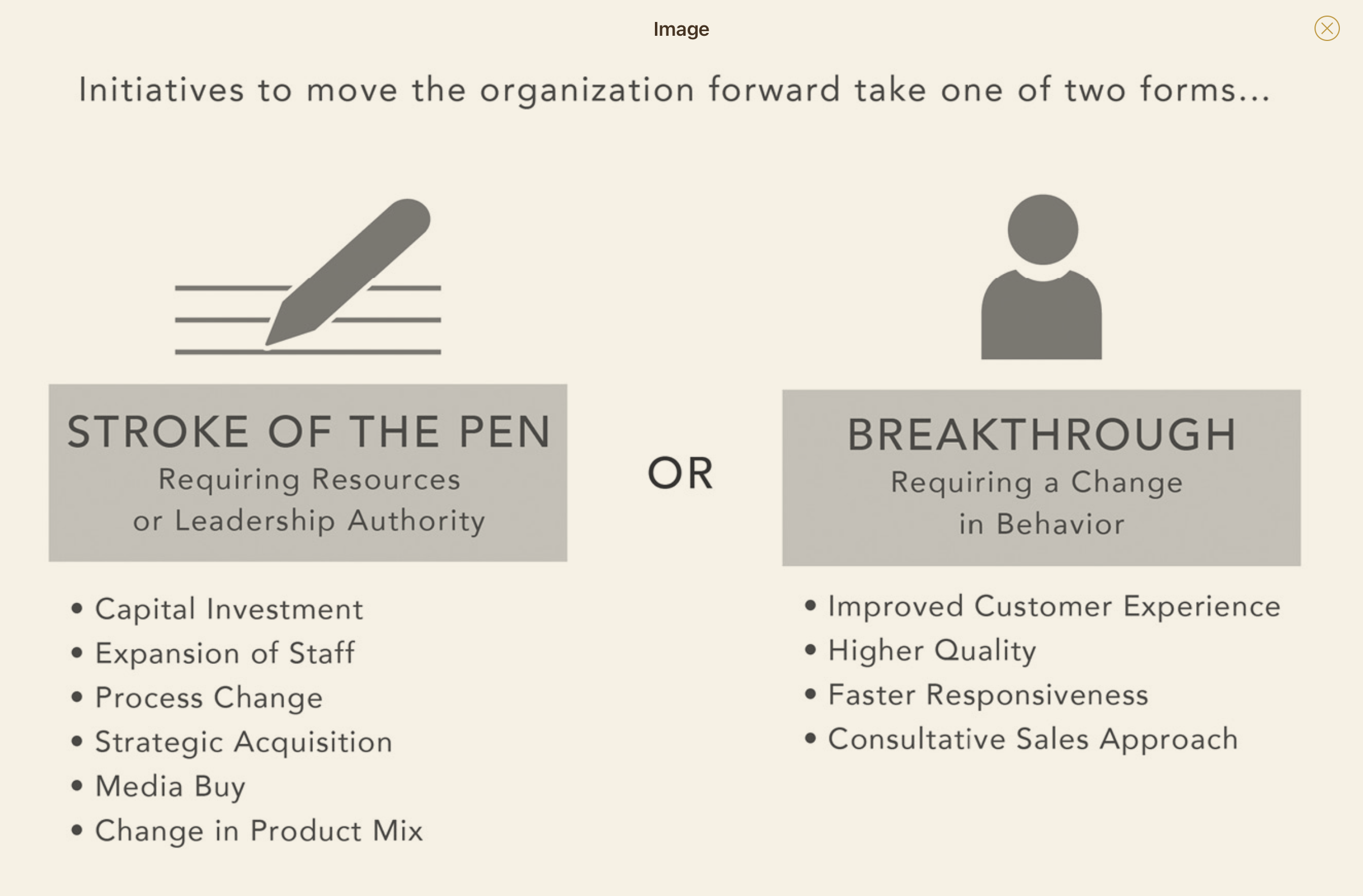 Any initiative you as a leader drive in order to significantly move your team or organization forward will fall into one of two categories. The first mainly requires a stroke of the pen, and the second is a breakthrough, requiring a change in behavior.