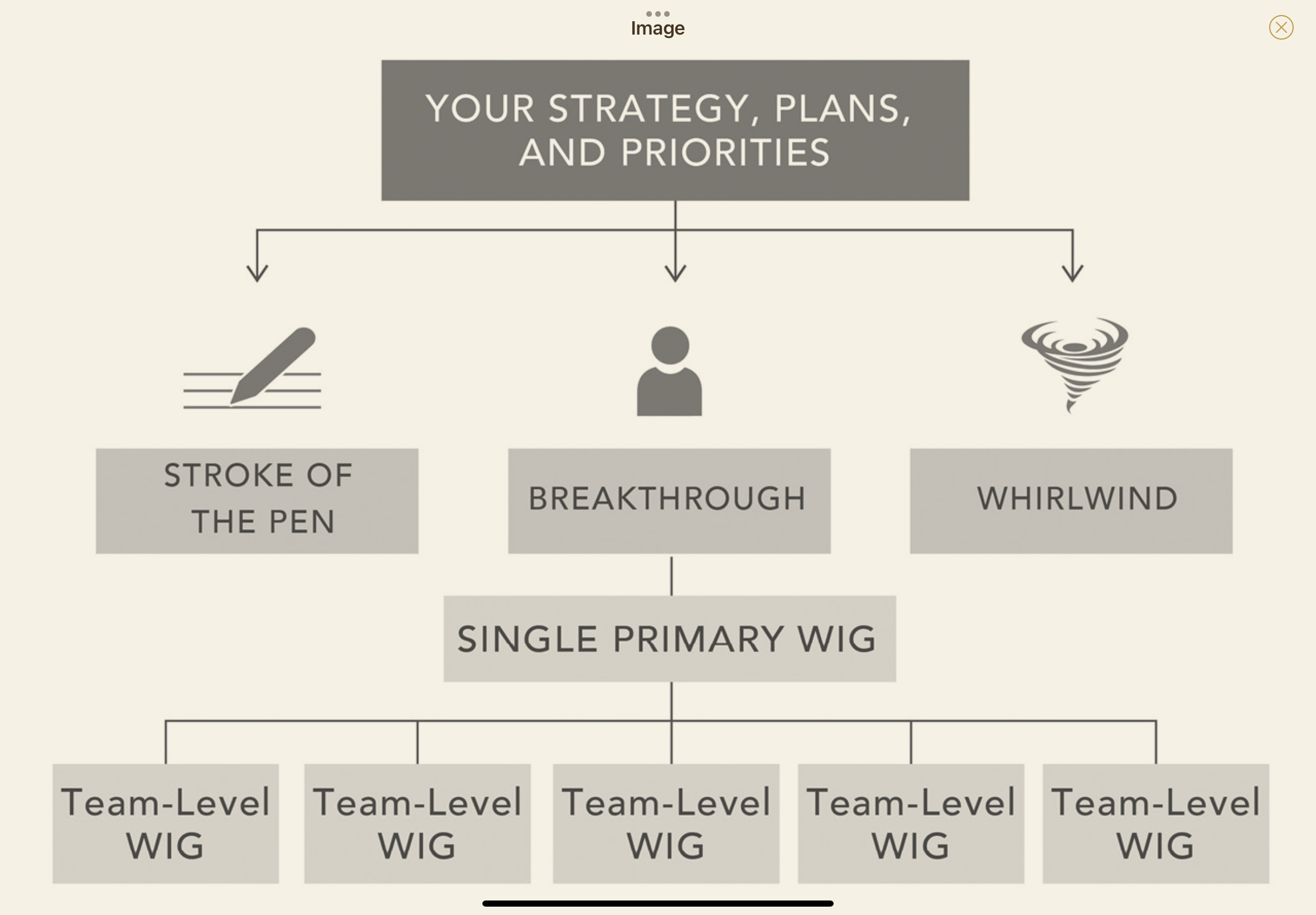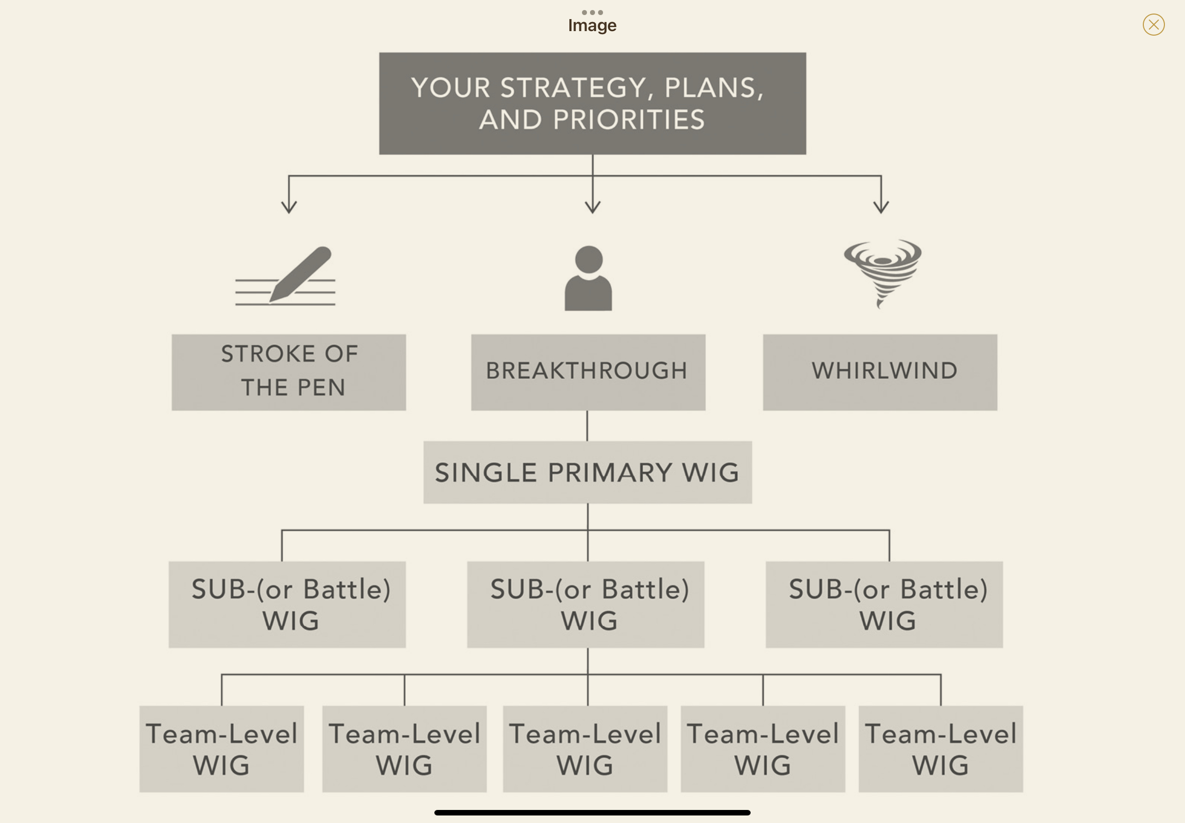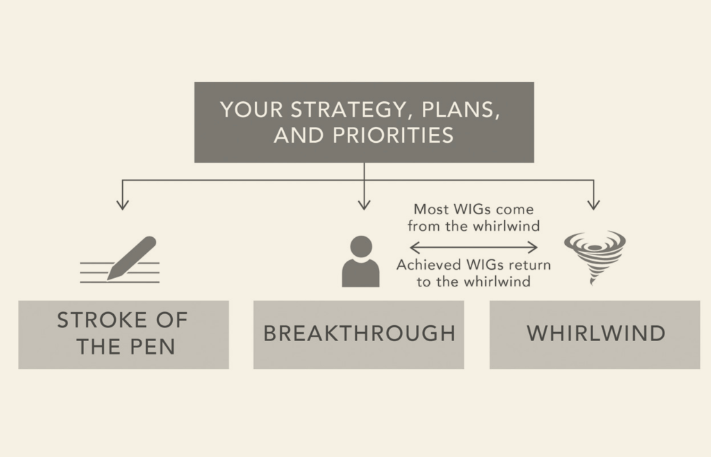 The second trap for leaders of leaders is trying to turn everything in the whirlwind into a WIG. This is an approach that is appealing because it allows you to package your entire whirlwind into a single all-encompassing goal. While it appears that you’ve narrowed your focus, the reality is that you’ve simply given your whirlwind a new name.