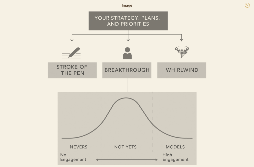 These two dynamics – pockets of excellence and variability of performance – exist in both the best – and worst-performing organizations. What actually separates the best and worst performers is the shape of their respective curves. The high performer’s adoption curve is more “right and tight”. So while leaders have to accept that they will always have an adoption curve, they do not have to accept the shape of that curve. Leaders who accept the shape of their adoption curve are, in a sense, giving up on improving execution and have limited themselves to improving results only through changing strategy. The purpose of the 4 Disciplines of Execution is to move the adoption curve right and tight, toward achieving a breakthrough.