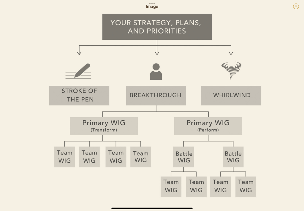 - The highest levels of execution are never reached when the strategy is devised solely by the top leaders of the organization and simply headed down to the leaders and teams below. Without the involvement of all, you cannot generate the high levels of commitment execution requires. While senior leaders will undoubtedly determine the Primary WIG, they must allow the leaders of frontline teams to have a significant role in defining the WIG for their own team.