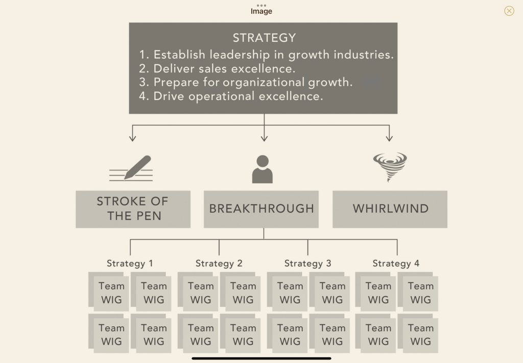 For example, the CEO said “I want these four strategic objectives to guide and direct the teams at the front line as they choose their Team WIG. It’s their choice to make, so long as it aligns to one of our four strategies.” So each team now had an essential responsibility: they needed to choose a Team WIG that would not only align to one of the four strategies but also represent their greatest possible contribution to the company’s success. With more than four hundred teams involved, driving this selection from the bottom up gave them two distinct advantages: