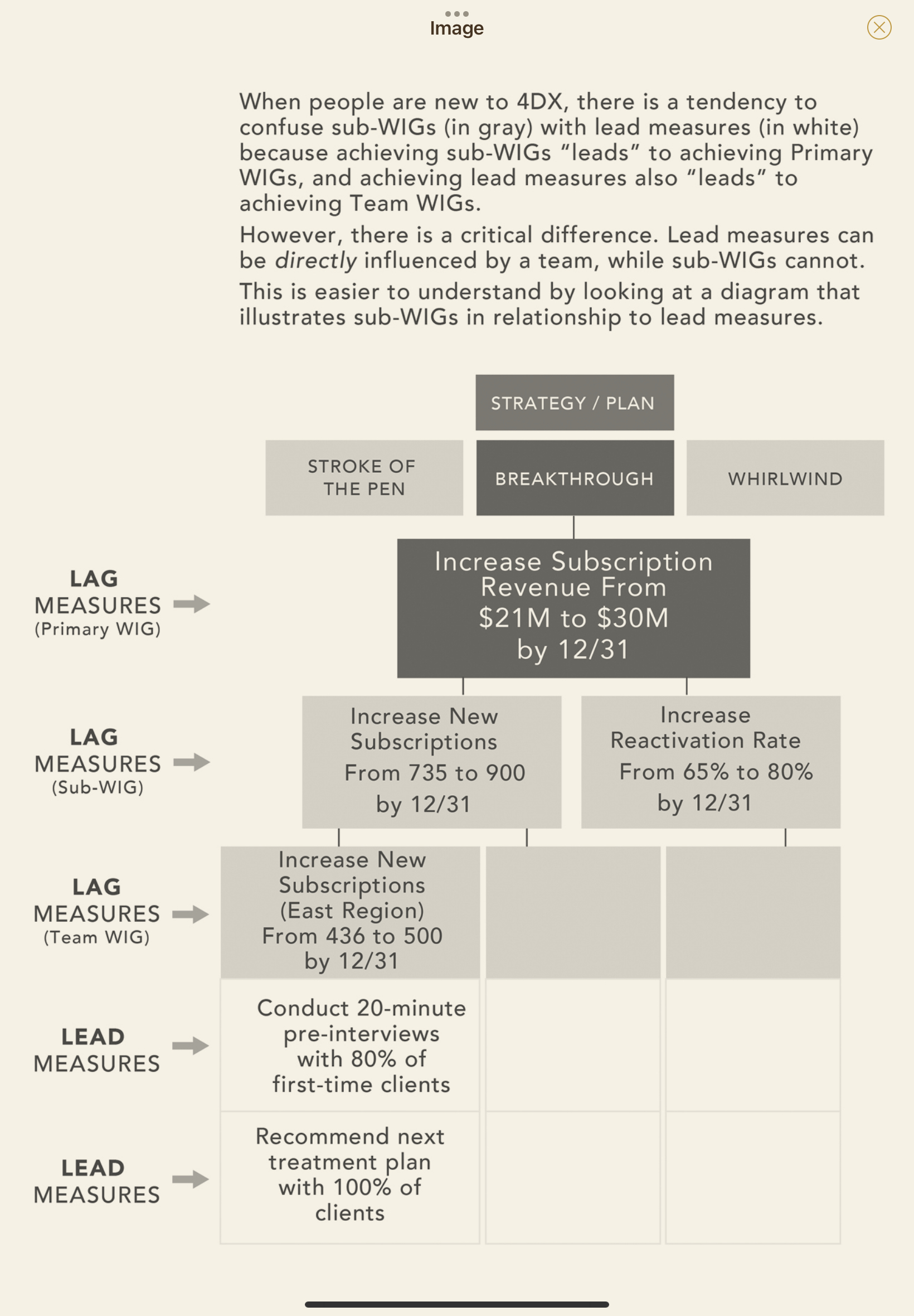 - This might sound like you’ve narrowed your focus (“See, folks, we have only one WIG: “Grow revenue”), but you haven’t. And everyone knows it. Separate your WIG from your normal results. Instead of “Grow revenue”, apply 4DX to a more specific portion of that overall outcome, such as “Grow revenue from midsize manufacturing companies in the southeastern region.”