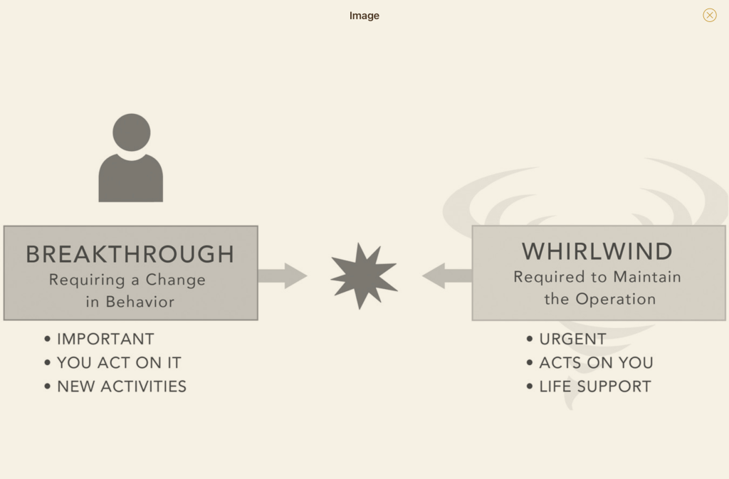 Unless you can achieve your goal with a stroke of the pen, success is going to require the people in your organization to change their behavior, and they simply cannot change that many behaviors at once, no matter how badly you want them to. Trying to significantly improve every measure in the whirlwind will consume all of your time and leave you with very little to show for it.