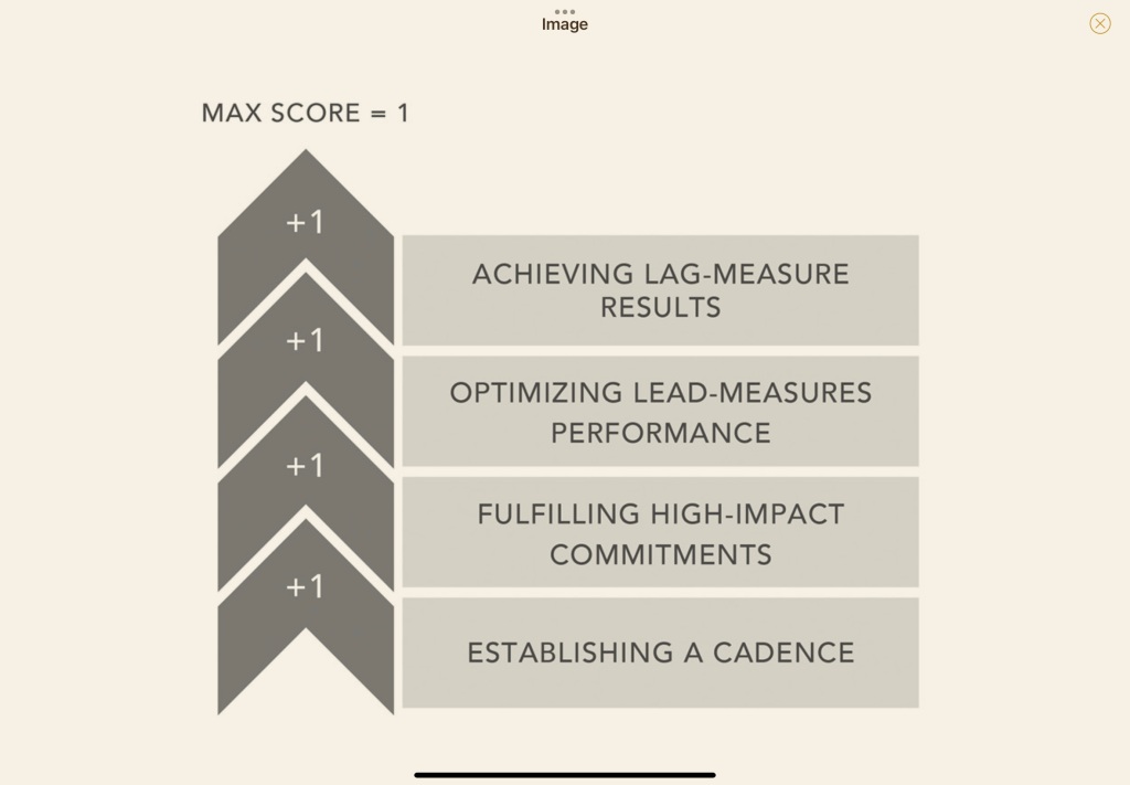 - this component indicates how well the team has established a cadence of meeting weekly to focus on the scoreboard