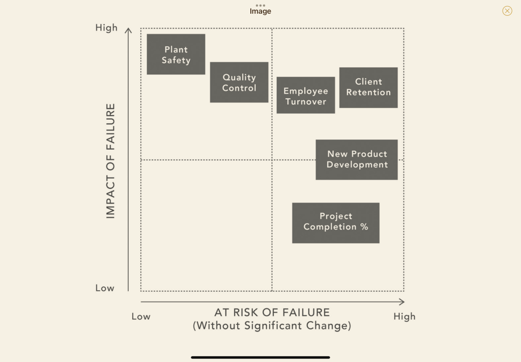 Identifying your breakthrough result: assess each candidate’s WIG on the two axes of “Impact of Failure” and “At Risk of Failure (Without Significant Change)”.